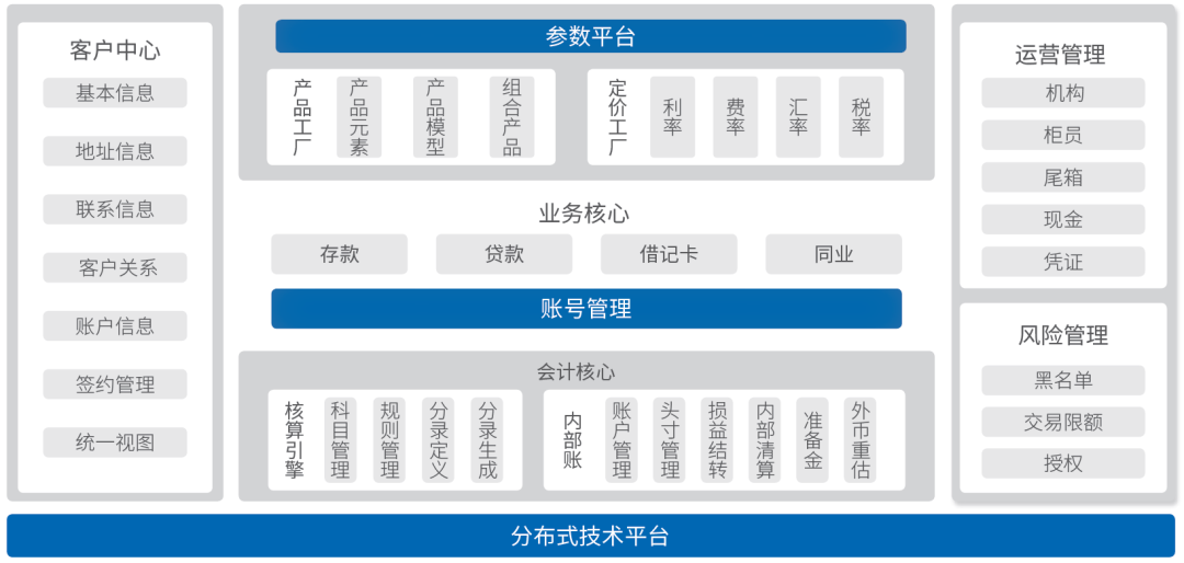 新一代分布式银行核心业务系统Sm@rtEnsemble包括客户中心、业务核心(存款业务、贷款业务等)、会计核心、营运管理以及风险管理等独立的业务服务模块。这些业务模块的参数都统一通过参数管理平台进行管理,并且通过金融产品工厂的配置形成具有各种特点的金融产品,通过金融服务规范接口对外提供各类银行核心业务处理功能。