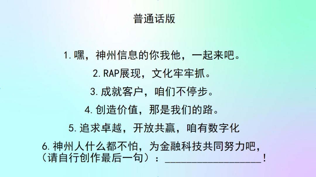 你对BB贝博艾弗森官网的新文化价值观熟悉吗?来来来,欢迎来参加神州Rapper挑战赛!让我们用最嗨皮的方式说出我们对BB贝博艾弗森官网新文化的理解。速度为王,又快又好!