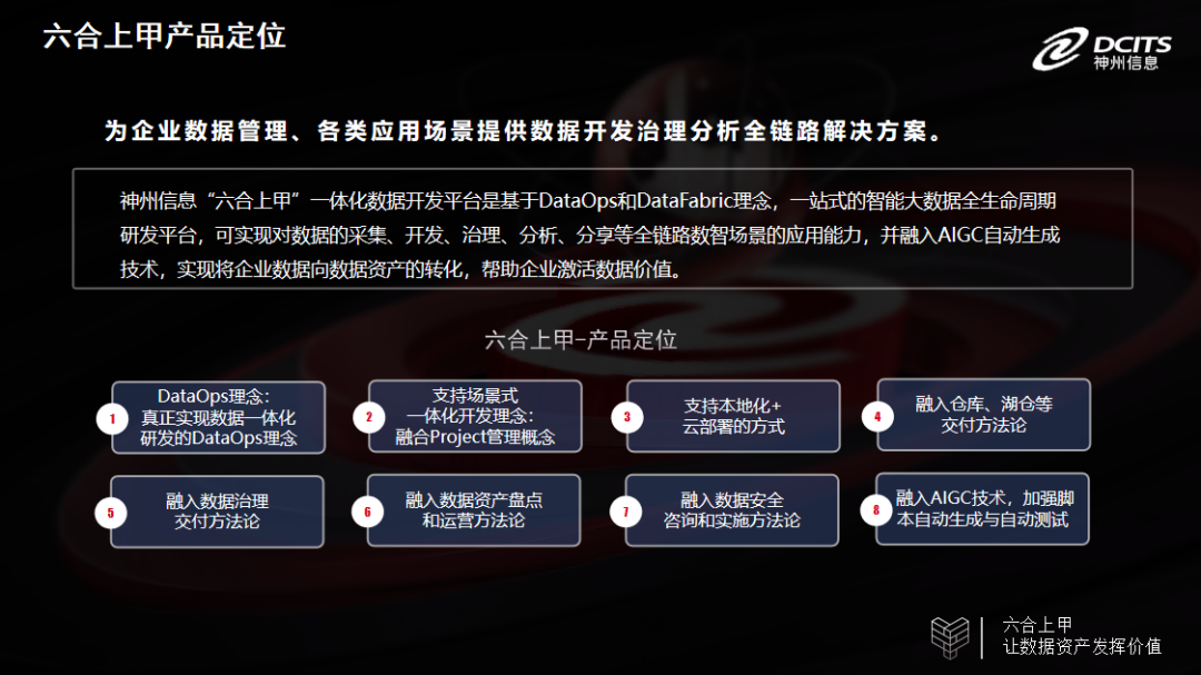 “上下四方谓之六合,一等神兵谓之上甲” 。六合上甲”在产品层面一方面代表了大数据时代浩瀚无垠的数据体量和广度;一方面则代表在大浪淘沙的数据处理和运用过程中,让数据发挥最大的价值,与企业发展紧紧相“合”。