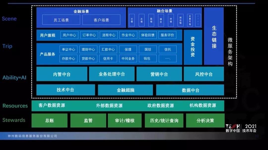 “场景建设”层是帮助拓展业务触角、提供统一交互体验、输出整体品牌形象的系统层次,一方面帮助金融企业建成“柜台服务、移动服务、远程服务与客户自助服务”相结合的线上线下融合服务模式,另一方面是依托生态链接系统体系,广泛开展跨行业合作,建立社群、农银、税银、银企、学银、供应链、交易市场等不同领域的融合场景,更好地将金融服务扎根于用户的生活生产过程当中,帮助金融机构实现场景与用户的连接,满足用户所需、赋能产业发展。“旅程服务”是ModelB@nk5.0整体架构的核心层次,由用户旅程、产品服务和资金投资三部分相关系统组成,强调按照用户在特定场景下的不同服务需求定制千人千面的流程体验及产品服务,让用户宛如在高端旅行中一般、舒服自然地享受不同内容的金融服务过程。“能力输出”层是金融企业将基础能力以集中方式向旅程服务进行输出的系统层次。由业务层面的四个中台体系,内管中台、业务服务中台、营销中台和风控中台,以及负责基础技术能力输出的三个中台体系,数据中台、技术中台以及金融超脑共同组成。金融超脑将提供整套AI能力应用,帮助业务系统和技术平台实现不同的智能化需求,释放出更强大的潜能。“资源积累”层,强调数字化经营过程中通过湖仓一体技术沉淀的数据资源,如客户数据资源、外部数据资源、政府数据资源、机构数据资源等。“资源积累”层沉淀的数据资源再通过数据中台实现数据的实时分析与传输,快速地将数据价值赋能到业务处理以及经营管理过程当中。“组织管理”层是整体架构面向金融企业监管、审计和经营管理等层面,保障金融企业平稳运行发展的根基。